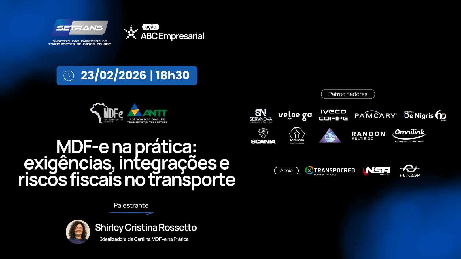 A palestra será conduzida por Shirley Cristina Rossetto, idealizadora da Cartilha MDF-e na Prática, com ampla experiência na aplicação dos documentos fiscais eletrônicos e na orientação de empresas do setor.